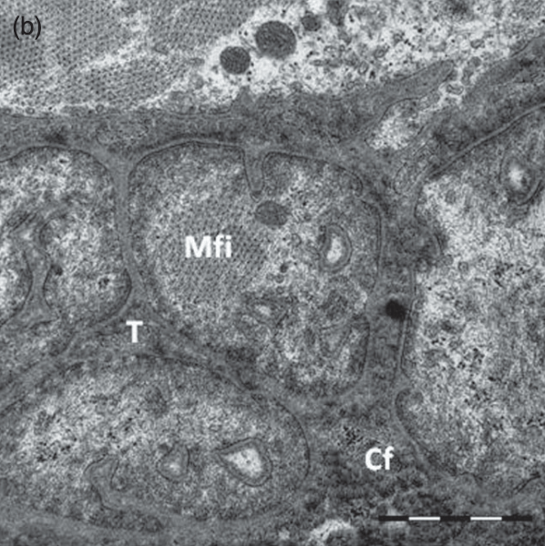 This image shows what’s going on deep inside the tendon, with muscle fibers being completely wrapped up by collagen fibers as they interweave. Usually, muscle fibers are wrapped by the endomysium, a specialized tissue that provides support and nutrition to the fibers. But at the junction, collagen provides the external wrap. In the picture below, “T” is tendon, “Mfi” is muscle fiber, and “Cf” is collagen fiber. It’s amazing to see muscle fibers directly wrapped in this woven collagen, providing an incredible junction between the two tissue types.