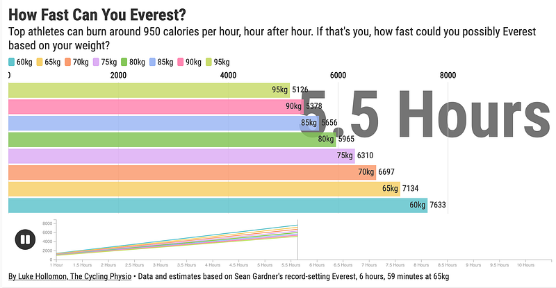 It also assumes that everything goes well, that you’ve picked out a good, steep course where you lose essentially nothing to wind resistance on the way up (>14% grade), and that you’re aerodynamic and fast on the way back down. It’s passed calibration against the times of some of the top Everesters, so it’s a good measure of what you may be able to do. That is, if you can keep pumping out the watts for 7–10 hours.